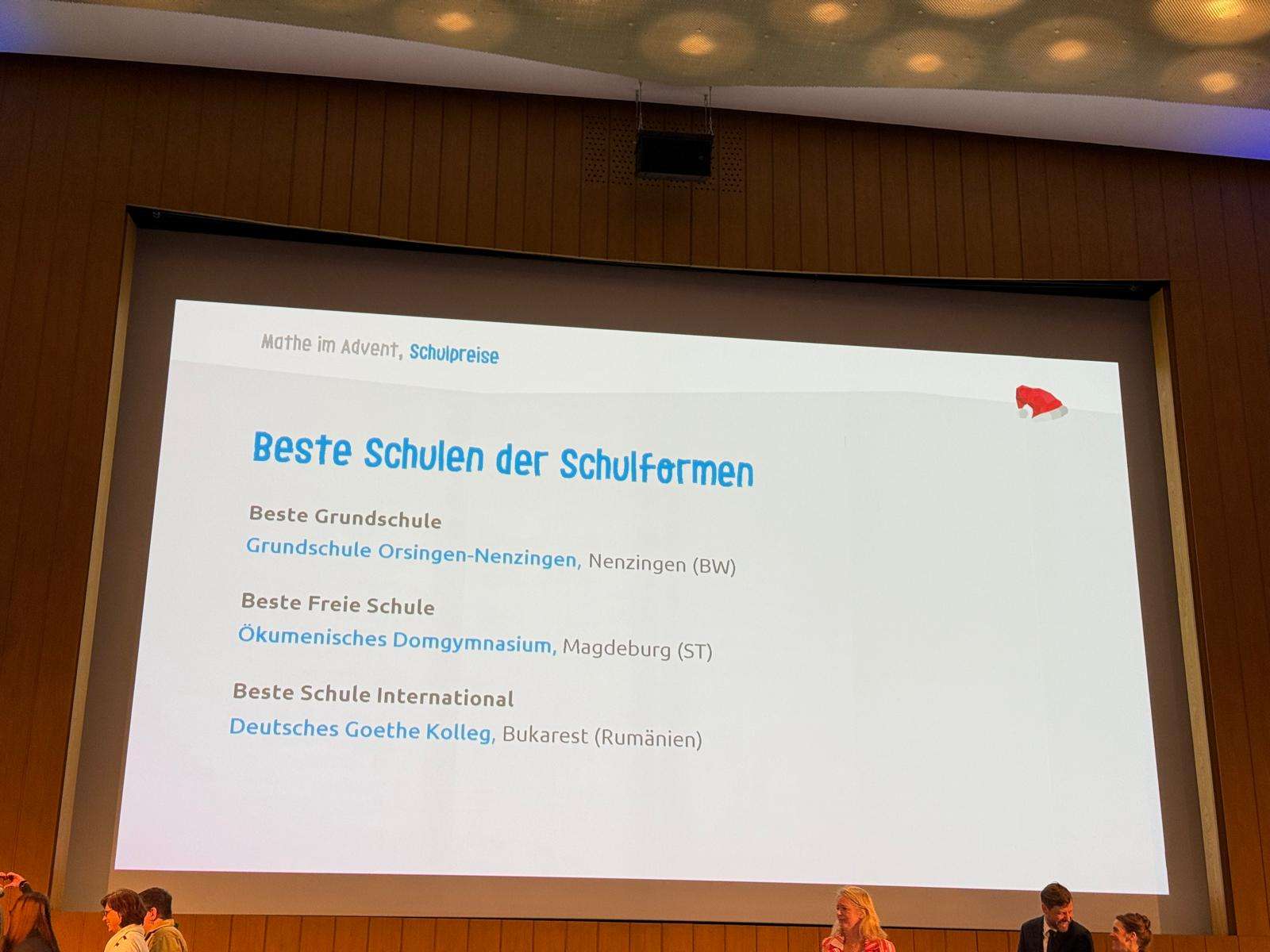 Ein besonderer Dank gilt den Förderern von „Mathe im Advent“, insbesondere der Gisela-und-Erwin-Sick-Stiftung, die die Teilnahme für Schulen aus dem Landkreis Konstanz kostenlos ermöglicht. Im Rahmen der regionalen Auszeichnung fand zudem eine zweite Preisverleihung für den Regierungsbezirk Freiburg in Waldkirch statt, zu der eine Delegation von acht Schülerinnen und Schülern sowie drei Begleitpersonen aus Orsingen-Nenzingen gereiset ist.